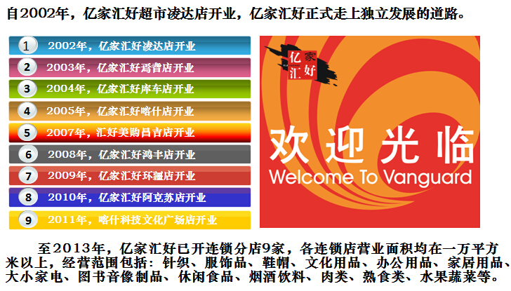 億家匯好商貿(mào)有限責(zé)任公司于2002年成立,并從臺灣引進(jìn)連鎖經(jīng)營職業(yè)管理團(tuán)隊(duì),統(tǒng)一管理旗下各地的連鎖超市。公司通過多年的穩(wěn)健發(fā)展,至2013年底,億家匯好商貿(mào)有限責(zé)任公司已成為擁有員工近3000多人,下轄一個(gè)配送中心和9家連鎖超市的大型綜合性零售企業(yè)。總經(jīng)營面積11萬多平方米,配送中心輻射公司所有超市,年配送額可達(dá)2億元。公司大量吸納下崗職工,經(jīng)過崗前培訓(xùn),提高勞動(dòng)技能,實(shí)現(xiàn)了他們的再就業(yè),為維護(hù)社會(huì)和諧穩(wěn)定做出了貢獻(xiàn)。2013年,巴州億家匯好商貿(mào)有限責(zé)任公司在自治區(qū)零售業(yè)中穩(wěn)踞前三位,是自治區(qū)重要的流通龍頭企業(yè),2013年年銷售收入達(dá)10億人民幣。多年來,公司一直重管理、抓實(shí)效、運(yùn)用先進(jìn)的管理手段和營銷理念,秉承億家匯好人 時(shí)時(shí)尋求效率創(chuàng)新,事事講究專業(yè)技術(shù)的文化精髓,創(chuàng)造了良好的經(jīng)濟(jì)效益和社會(huì)效益。公司先后多次被消費(fèi)者協(xié)會(huì)評為誠信單位,并多年被評為重合同,守信用單位。